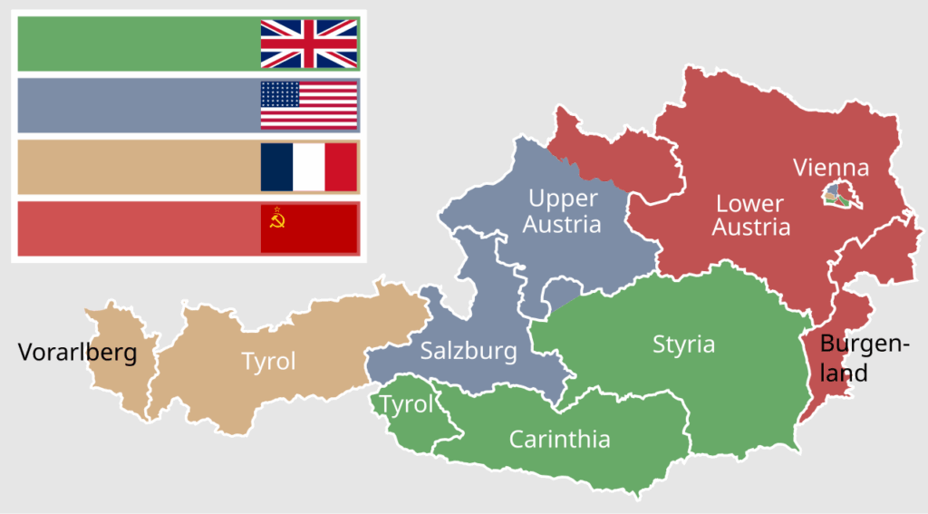 Maa jaettiin neljään miehitysvyöhykkeeseen. Neuvostoliitto sai hallintaansa Ala-Itävallan, Burgenlandin ja Ylä-Itävallan pohjoisosan, Yhdysvallat Salzburgin ja suurimman osan Ylä-Itävaltaa, Iso-Britannia Steiermarkin ja Kärntenin ja Ranska Tirolin ja Vorarlbergin.