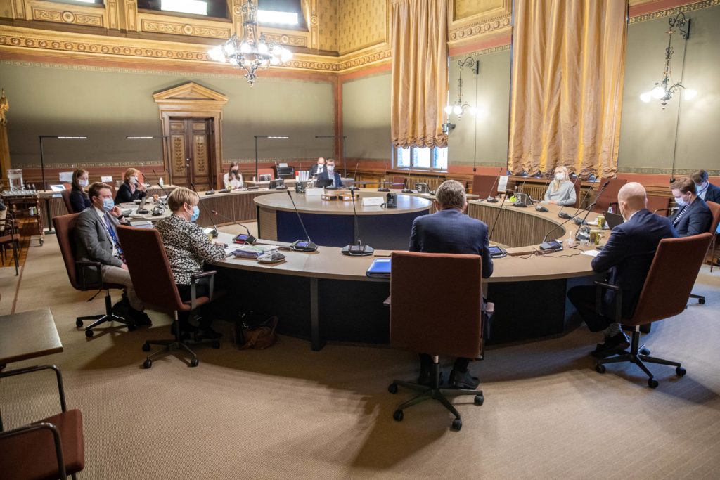 Puolustusministeri Antti Kaikkonen (kesk.) ja valtiosihteeri Maria Kaisa Aula. Kuva: Jussi Toivanen / Valtioneuvoston kansliaPääministeri Sanna Marin (sd.). Kuva: Jussi Toivanen / Valtioneuvoston kansliaMaa- ja metsätalousministeri Jari Leppä (kesk.) ja erityisavustaja Teppo Säkkinen. Kuva: Jussi Toivanen / Valtioneuvoston kansliaVaikeimpia kysymyksiä ratkottiin hallituksen johtoviisikon kesken. Kuva: Jussi Toivanen / Valtioneuvoston kansliaTiede- ja kulttuuriministeri Annika Saarikko ja oikeusministeri Anna-Maja Henriksson (r.). Kuva: Jussi Toivanen / Valtioneuvoston kansliaPääministeri Sanna Marin ja sisäministeri Maria Ohisalo (vihr.). Kuva: Jussi Toivanen / Valtioneuvoston kansliaOpetusministeri Jussi Saramo (vas.) ja valtiovarainministeri Matti Vanhanen. Kuva: Jussi Toivanen / Valtioneuvoston kansliaTiede- ja kulttuuriministeri Annika Saarikko antoi kommentteja medialle. Kuva: Jussi Toivanen / Valtioneuvoston kansliaYmpäristö- ja ilmastoministeri Krista Mikkonen (vihr.) poistui Säätytalolta perjantai-iltana. Kuva: Jussi Nukari / LehtikuvaElinkeinoministeri Mika Lintilä (kesk.) poistumassa Säätytalolta. Kuva: Jussi Nukari / Lehtikuva