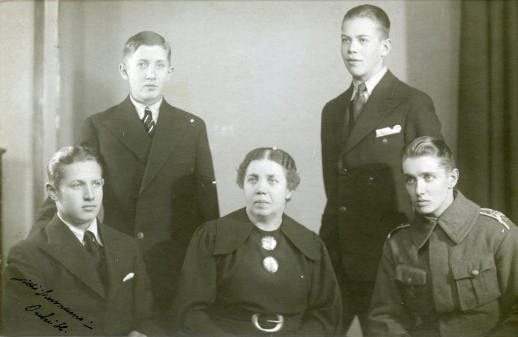 Veikko Tenhovaara (vas.) oli veljesnelikosta ainoa, joka selvisi rintamalta hengissä. Arvon, Laurin ja Olavin kohtalo oli toinen. Keskellä veljesten äiti. (Kuva: Osmo Piisalon Kotialbumi)