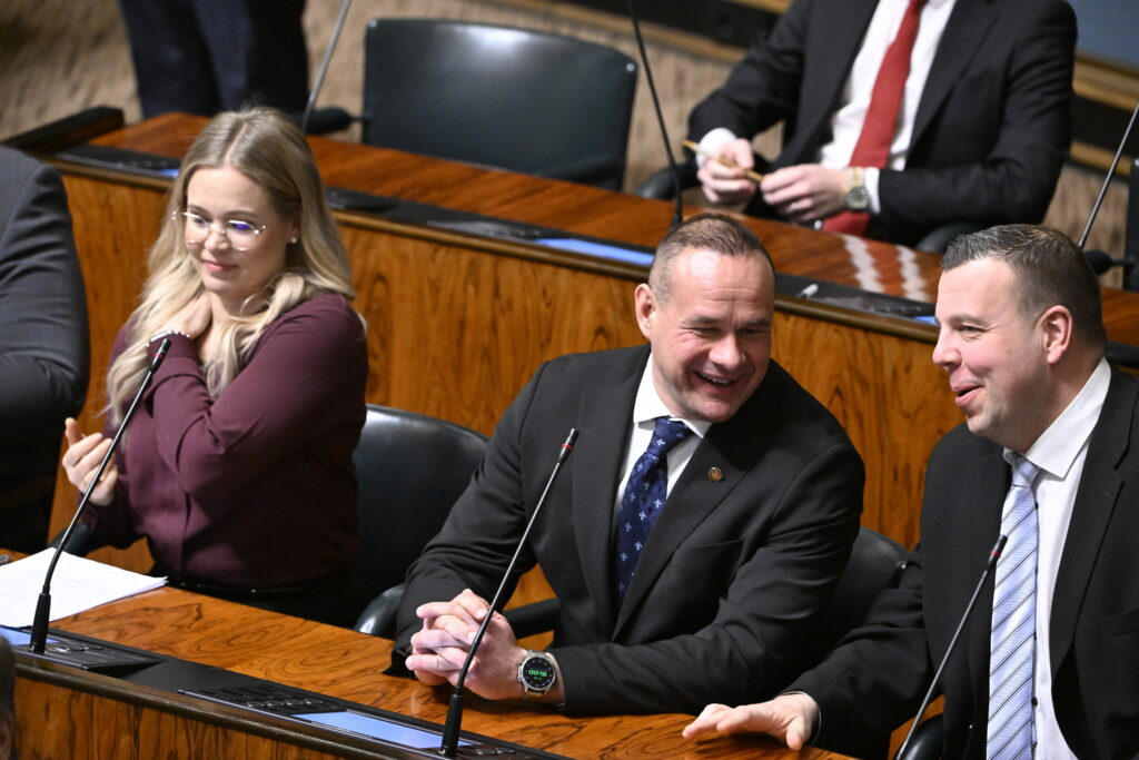 Perussuomalaiset jättänyt kansanedustaja Mikko Polvinen (kesk.) eduskunnan suullisella kyselytunnilla Helsingissä 5. helmikuuta 2026. Polvisen vasemmalla puolella perussuomalaisten Sara Seppänen ja oikealla Mikko Lundén (ps). HEIKKI SAUKKOMAA / LEHTIKUVA