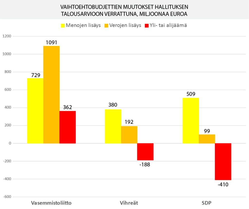 Artikkelia on täydennetty ja täsmennetty 15.11. klo 19.29: Kirjoituksessa käytetyt Eduskunnan tietopalvelun luvut osoittavat vaihtoehtobudjettien tulovero- ja sosiaaliturvamuutosten eli reformien vaikutuksen julkisen talouden rahoitusasemaan ja kotitalouksien käytettävissä oleviin tuloihin, eivät koko budjettien tasapainoa.