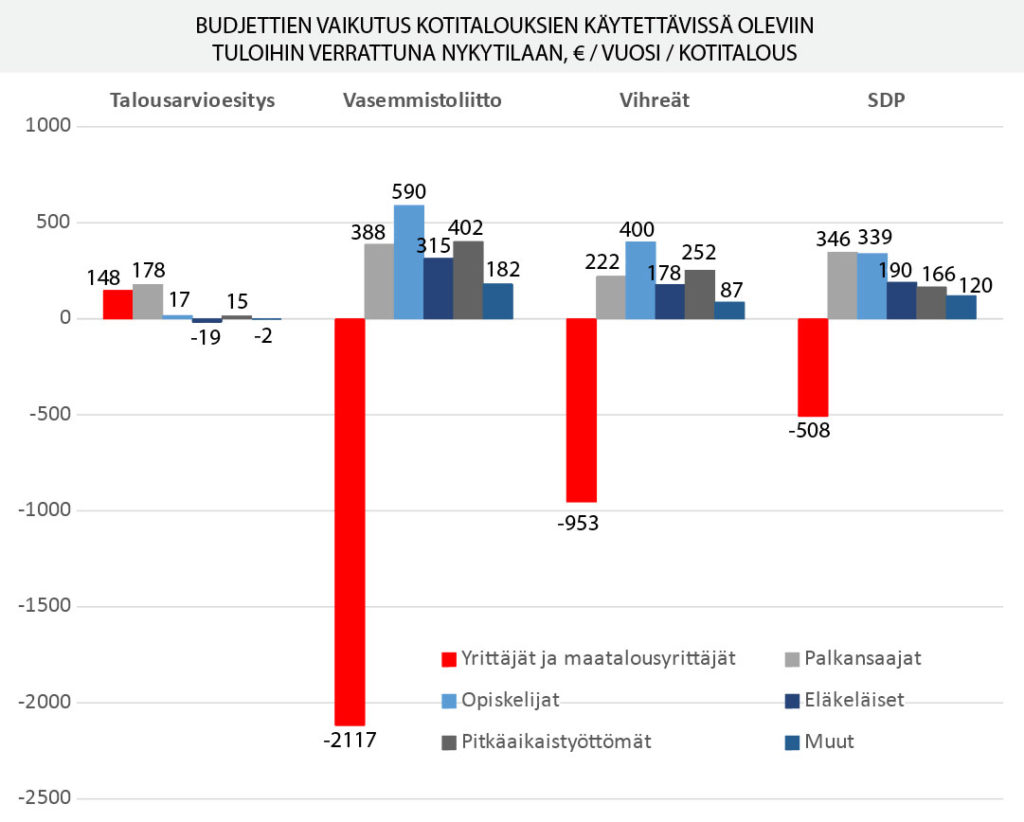 Yrittäjien ja maatalousyrittäjien menetykset ovat selvästi suurempia, vasemmistoliiton budjetissa 176 euroa kuukaudessa, vihreillä 79 ja SDP:llä 42.