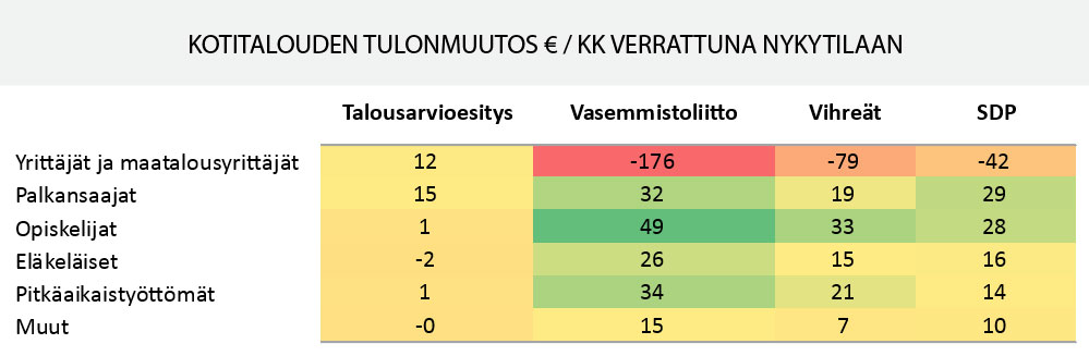 Yrittäjille ja maatalousyrittäjille käy kehnosti, heidän pussistaan kaivetaan melkein sama summa kuin muille jaetaan. Kaikki rokottavat ronskisti myös hyvätuloisia, joita vasemmistoliitolle ovat yli 6 500 euroa kuukaudessa ansaitsevat, muilla raja on vähän korkeampi.