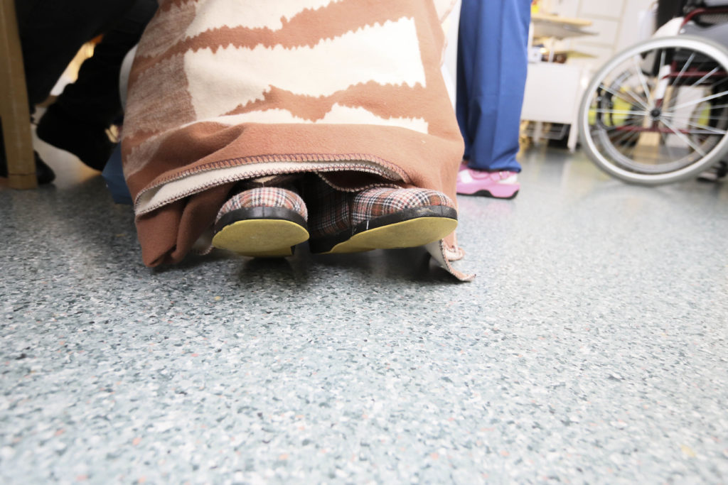 Seinällä olevassa lehtileikkeessä kerrotaan, että lähes joka viides laitoshoidossa oleva vanhus elää sängyssä. ”He viettävät vähemmän kuin kolme tuntia vuorokaudessa sängyn ulkopuolella muiden ihmisten seurassa.”