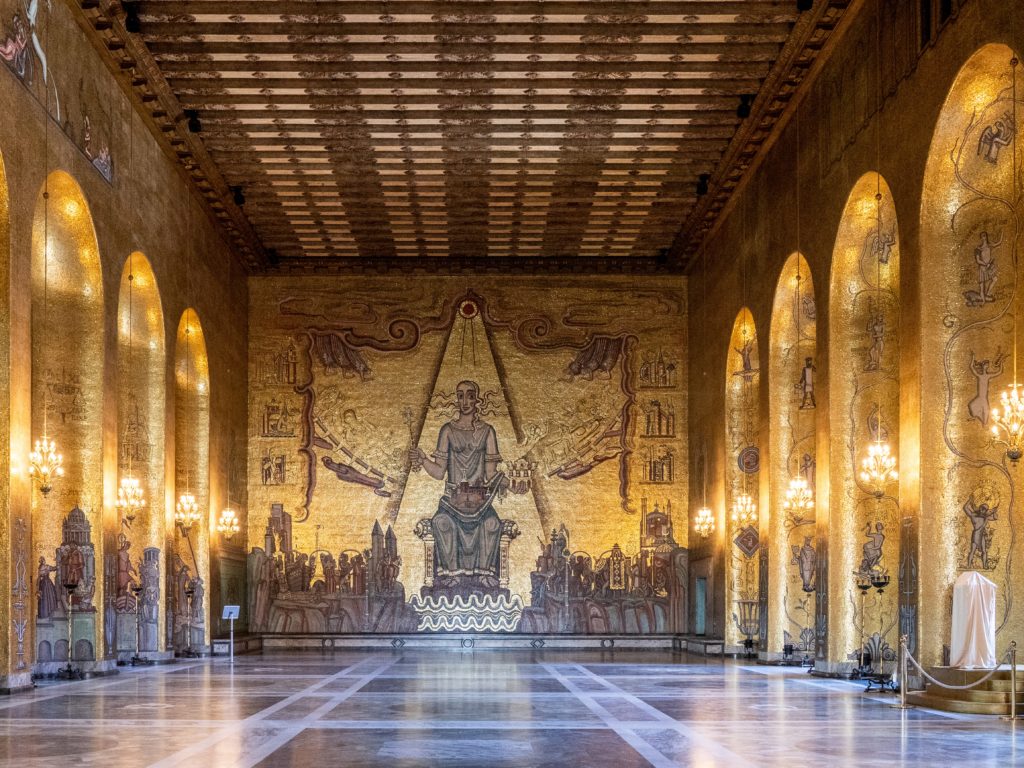 Kaupungintalon Kultainen Sali (Gyllene Sallen) tuo entistä enemmän mieleen kirkollisen tilan tai taidenäyttelyn. Se ei ole ihme: sisään holvi-ikkunoista siivilöityvä keväinen valo osuu takaseinän valtavaan freskoon, jonka tekijä oli Ruotsin prinssi, tunnustettuna taidemaalarinakin tunnettu Eugen (1845–1947).