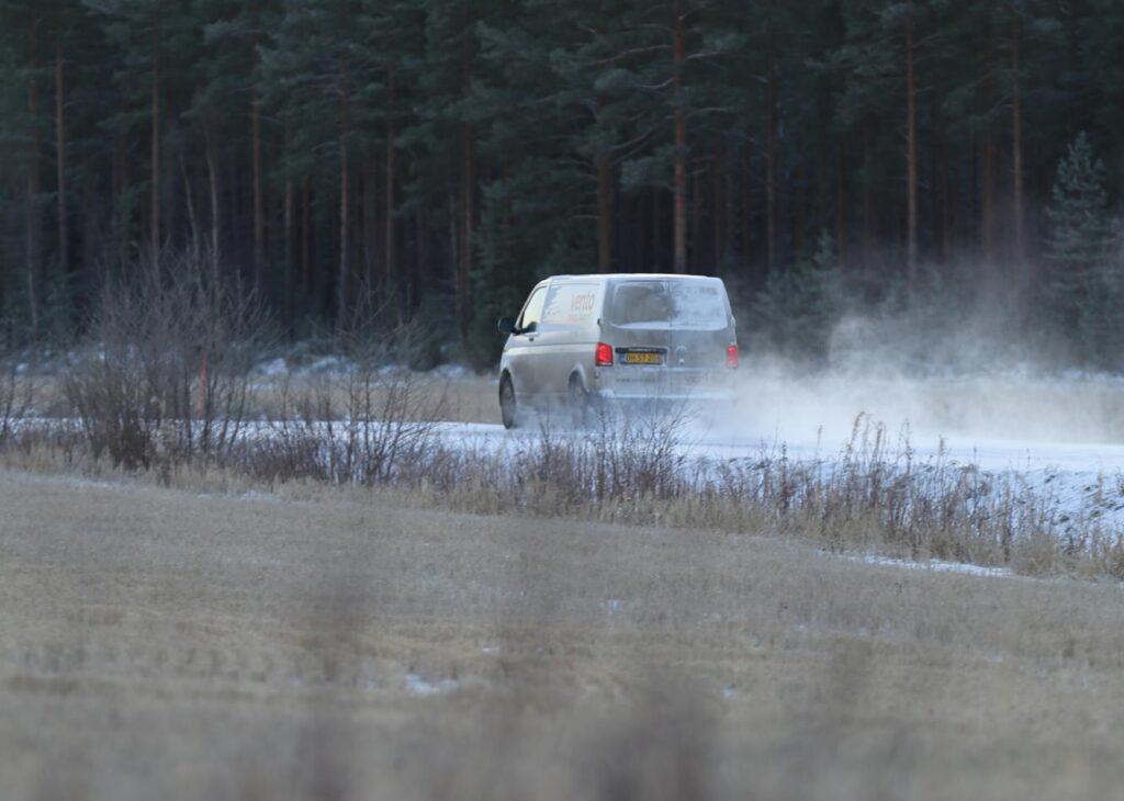 Ja sitten kaahaa Postin jakeluauto, välissä joku yksittäinen kulkija. Muuten on hiljaista. Toimituksen auton voi rauhassa pysäyttää tienposkeen vilkut päällä kuvien ottamista varten.